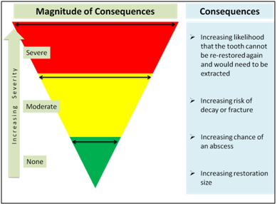 The larger the cavity or more severe the fracture the more complicated it is to repair a tooth back to a normal condition. One consequence of severe decay or fracture, because it extends deeply into the center of a tooth, is an abscess. An abscess is frequently very painful and occasionally can spread deeper into the body creating a very serious health condition that requires advanced medical care and possibly hospitalization. Another consequence is too little remaining tooth for a filling or crown. Extraction of a tooth is not always needed when any of these complications occur. Dental treatment that may “save” the tooth includes a root canal and exposure of a portion of the tooth currently covered by gum tissue.